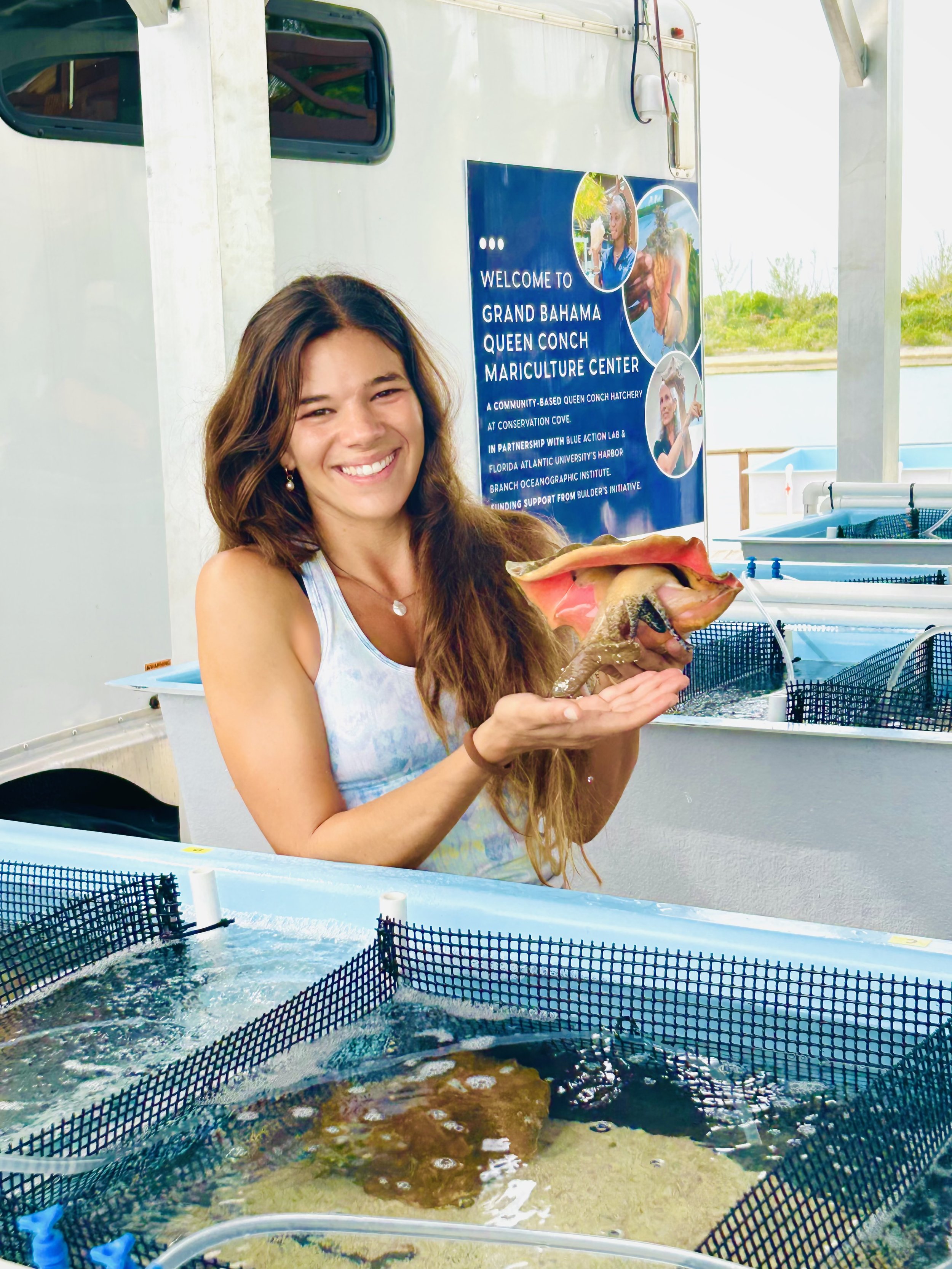 In 2023, she joined the Queen Conch Lab, where she works on various conch projects, including egg production, larval culture, and outreach. A key achievement was helping establish a reliable captive breeding colony of milk conch (a close relative of the queen conch) at FAU Harbor Branch, which is paving the way for establishing captive queen conch breeding colonies for restoration aquaculture. This was achieved by incorporating novel algal turf scrubbers (ATS) into the conch's diet, resulting in prolific near-daily spawning from the 16-member breeding colony.